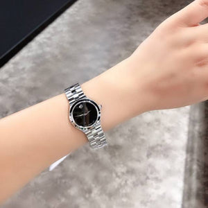 Stainless steel case and bracelet. Fixed stainless steel bezel. Black dial with silver-tone dauphine-style hands. No markers. The Movado dot appears at the 12 o'clock position. Dial Type: Analog. Quartz movement. Scratch resistant sapphire crystal. Pull / push crown. Solid case back. Round case shape. Case size: 26 mm. Butterfly clasp. Water resistant at 50 meters / 165 feet. Functions: hour, minute. Juro Series. Casual watch style. Watch label: Swiss Made. Movado Juro Quartz Black Dial Ladies Watch 0607444.