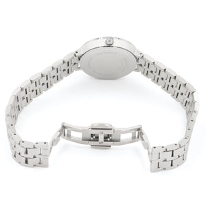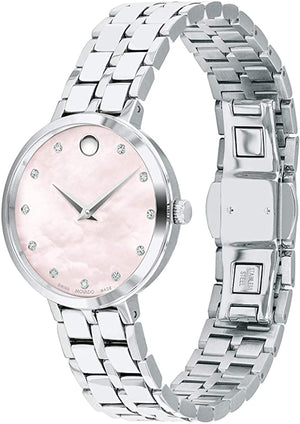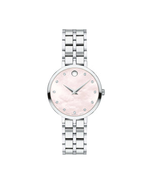 Movado Kora, 28 mm stainless steel case and bracelet with pink mother-of-pearl dial and 11 diamond markers. Quartz movement. Water resistant to 30 meters. Note: Mother-of-Pearl dials may vary in color as each piece is unique making every watch one of a kind.