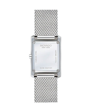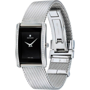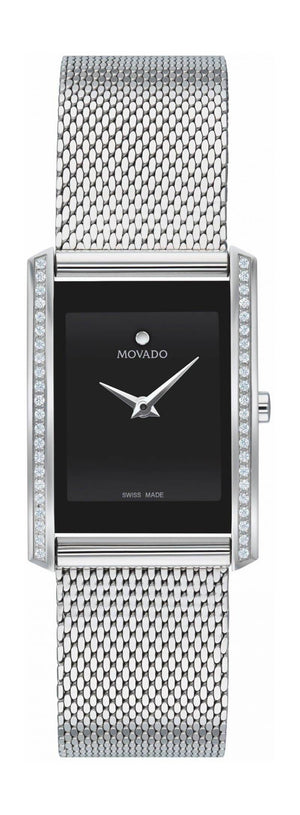Stainless steel case with a stainless steel mesh bracelet. Fixed stainless steel bezel set with diamonds. Black dial with silver-tone dauphine-style hands. No markers. The Movado dot appears at the 12 o'clock position. Dial Type: Analog. Quartz movement. Scratch resistant sapphire crystal. Pull / push crown. Solid case back. Rectangle case shape. Case dimensions: 21 mm x 29 mm. Fold over clasp with a push button release. Water resistant at 30 meters / 100 feet. Functions: hour, minute. Additional Info: case set with 44 diamonds (0.172 t.c.w). La Nouvelle Series. Dress watch style. Watch label: Swiss Made. Movado La Nouvelle Black Dial Ladies Diamond Watch 0607190.