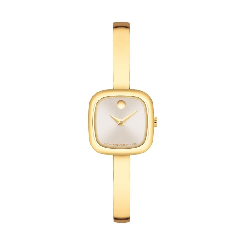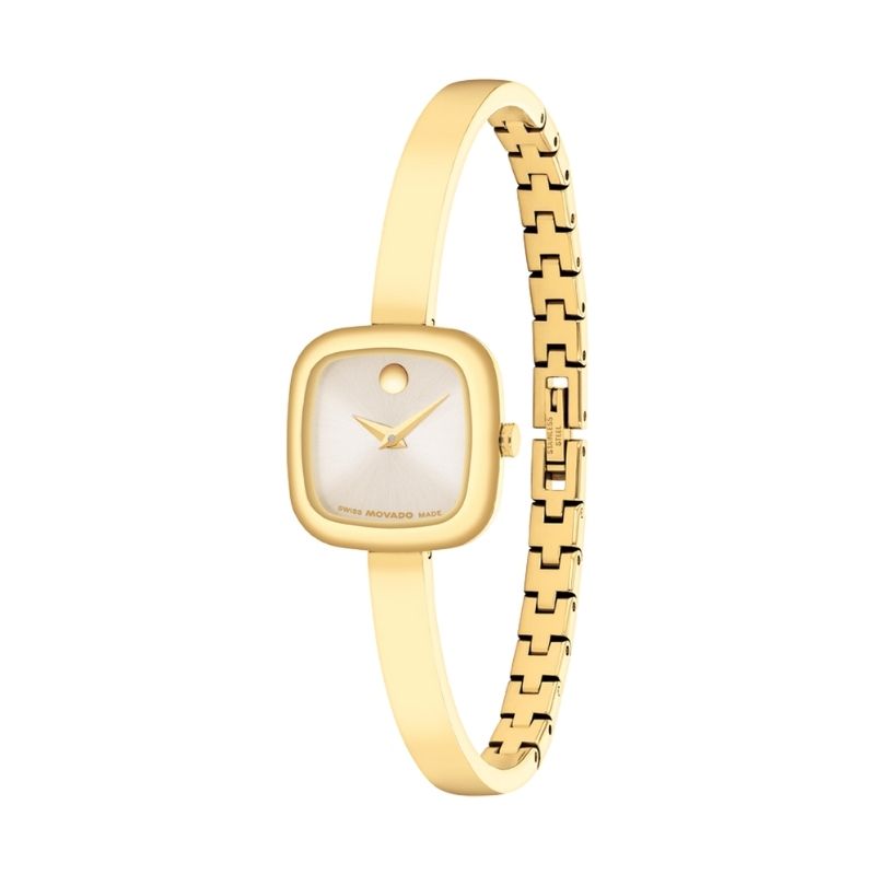 Modern, minimal, and made to stack. The Jewelry-Inspired Movado Museum Bangle. This 21.5mm watch features a cushion champagne sunray dial, yellow gold tone dauphine hands, and our signature dot at 12 o'clock.