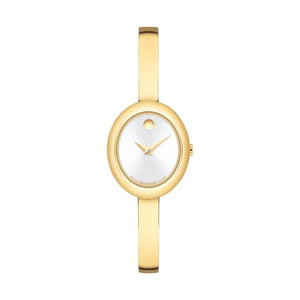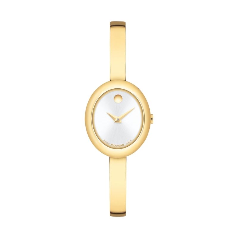Modern, minimal, and made to stack. The Jewelry-Inspired Movado Museum Bangle. This 21.5mm by 25.5mm watch features an oval silver white sunray dial, yellow gold tone dauphine hands, and our signature dot at 12 o'clock.