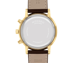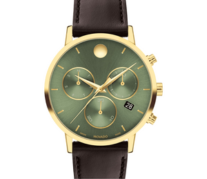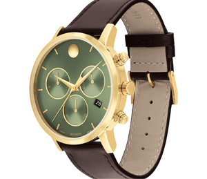 The Museum Classic is the purest interpretation of Movado's Museum Dial—an icon of modern design featured in art institutions around the world. This 42mm chronograph watch features a green dial with tonal subdials, a chocolate leather strap, and our signature dot at 12 o'clock. Quartz movement. Water resistance up to 30 meters. Sapphire crystal. Pin buckle clasp.