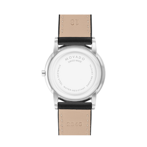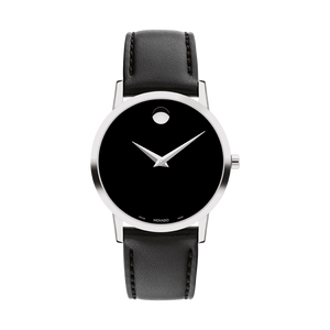 Black Museum dial enhanced by silver-tone hands. Silver-tone stainless steel case with a black (calfskin) leather band. Quartz movement. 30 meters / 100 feet water resistance. Fixed bezel. Scratch Resistant Sapphire crystal. Solid caseback. Tang clasp. Pull / Push crown. Case size 33 mm. Band 18 mm x long. Movado 0607583 Classic Watch