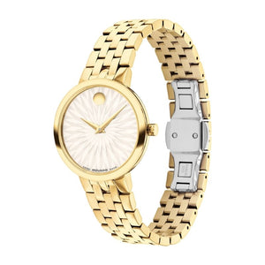 The Museum Classic is the purest interpretation of Movado's Museum Dial—an icon of modern design seen in art institutions around the world. This 29.5mm watch features a white origami-inspired textured dial, yellow gold tone dauphine hands, and our signature dot at 12 o'clock.