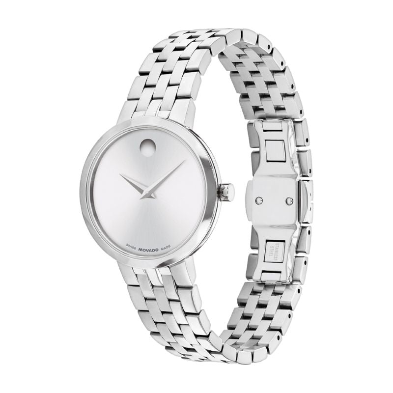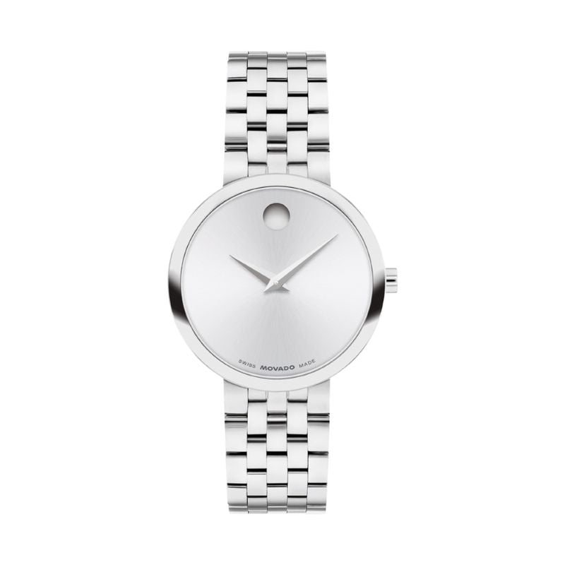 The Museum Classic is the purest interpretation of Movado's Museum Dial—an icon of modern design seen in art institutions around the world. This 29.5mm watch features a silver white sunray dial, steel dauphine hands, and our signature dot at 12 o'clock.