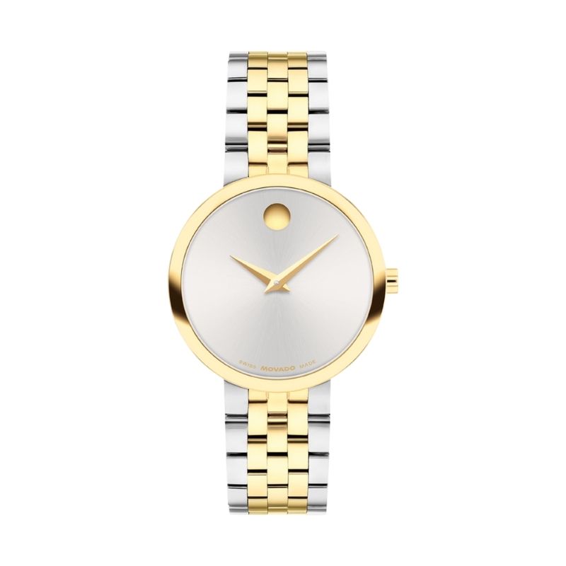 The Museum Classic is the purest interpretation of Movado's Museum Dial—an icon of modern design seen in art institutions around the world. This 29.5mm watch features a silver white sunray dial, yellow gold tone dauphine hands, and our signature dot at 12 o'clock.