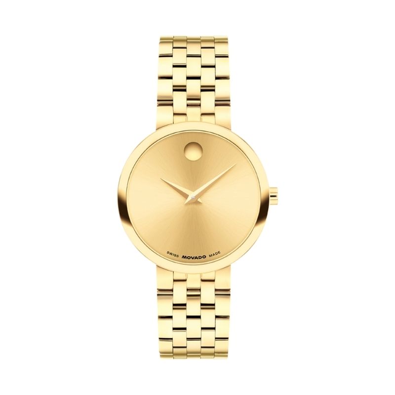 The Museum Classic is the purest interpretation of Movado's Museum Dial—an icon of modern design seen in art institutions around the world. This 29.5mm watch features a yellow gold tone sunray dial, matching dauphine hands, and our signature dot at 12 o'clock.