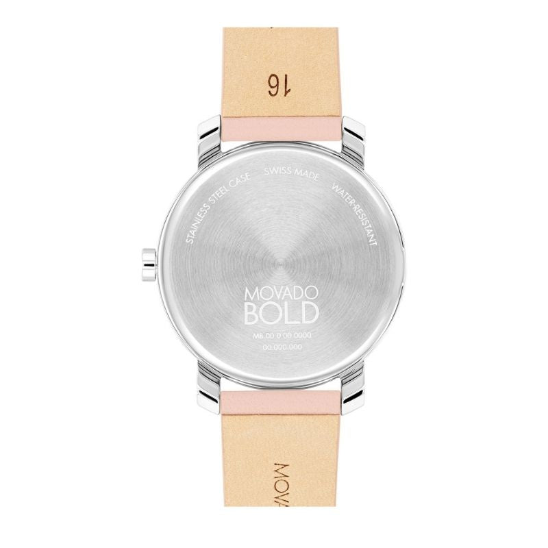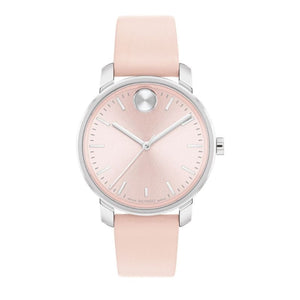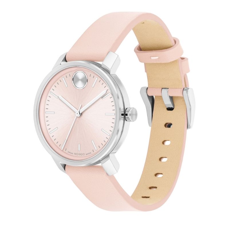 Women's Movado Trend, 34mm stainless steel case, light pink leather strap, blush dial, K1 mineral crystal, Swiss quartz movement. Pin buckle clasp.