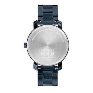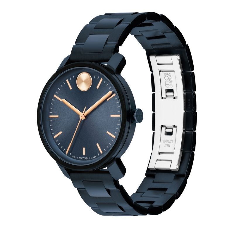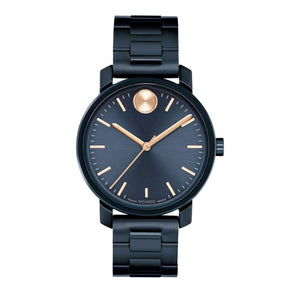 Women's Movado Trend, 34mm ionic plated blue steel case and bracelet, blue dial, K1 mineral, Swiss Quartz Movement.