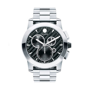 Movado vizio chronograph, 45 mm stainless steel case with dura904 steel bezel and black carbon fiber chronograph dial. Features a screw down crown, swiss super luminova accents, engraved caseback, and stainless steel bracelet. Case size 45mm. Quartz movement. Water resistant up to 50 meters. Sapphire crystal. Push button deployment clasp.