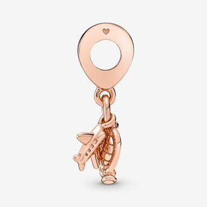 Fly away on a dream adventure with this 14k rose-gold plated travel charm. This triple dangle charm features three symbols of travel: an airplane, a globe and a suitcase with lifelike corner details and a tiny pink enamel heart. Style it on your Pandora Moments pieces to carry your travel memories with you and look forward to new adventures.
