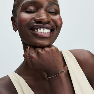 Add boldness to your look with the Black Sparkling Tennis Bracelet. Plated with 14k rose gold, it showcases 48 prong-set black man-made crystals in squared open baskets. The adjustable closure with a dangling stone offers a personalized fit. Ideal for stacking with various colours and metals, this bracelet introduces a bold black stone to Pandora's Timeless collection. Experience the elegance of repetition and contrast, adding depth to your bracelet stack..