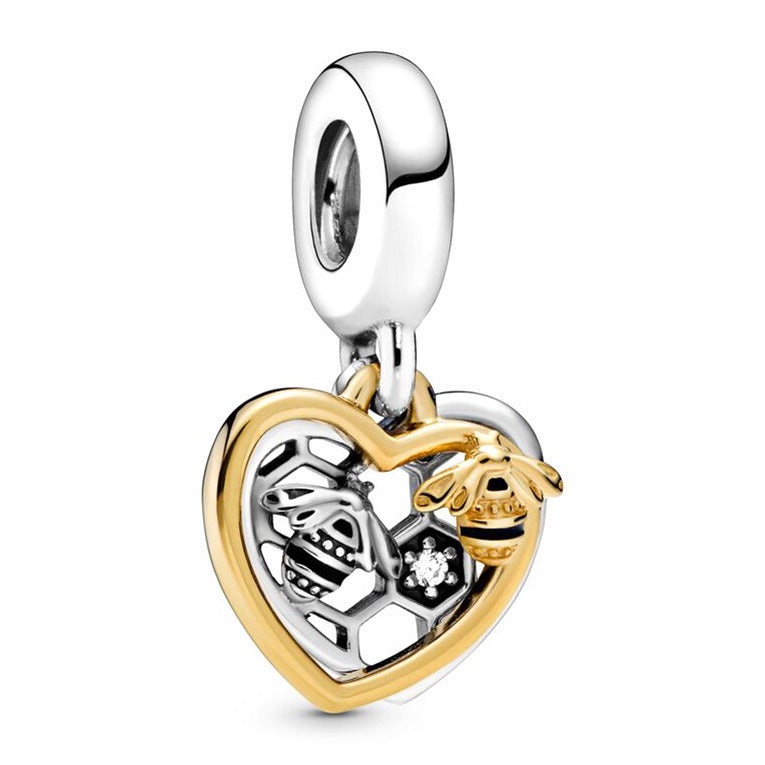 Say “We beelong together” with an engraved message on the heart-shaped bee double dangle charm. Made in a two-tone finish from sterling silver and Pandora Shine, 18k gold-plated unique metal blend, the charm features bees made from both metals on each of the dangles. Together, they symbolise the hard-working and loving community of a beehive coming together for a higher purpose. The back disc features honeycomb cut-outs to remind us that nothing is impossible when you stick together.