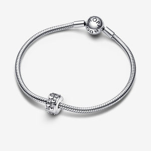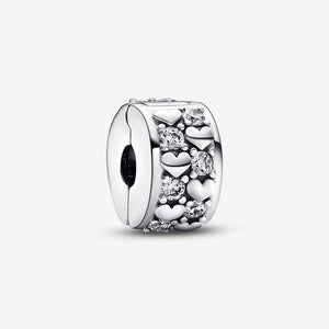 Secure your charms and keep them safe with this symbol of love. Crafted in sterling silver, the Infinite Hearts Sparkling Clip Charm features two rows of raised hearts with sparkling stones for a more elevated look. Wear it on your bracelet and let your favourite charms stand out. Please note: this clip charm features a silicone grip and does not fit over threads (the two raised charm dividers).