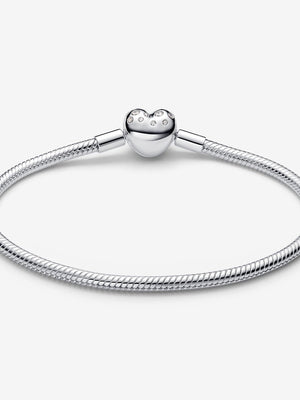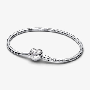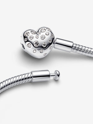 Radiate love with our Pandora Sterling Silver Lab-grown Diamond Heart Clasp Snake Chain Bracelet. Crafted from sterling silver, this meaningful bracelet meets at the center with a heart-shaped clasp, featuring 29 flush-set lab-grown diamonds of different shapes and sizes that scatter across its surface. The sprinkling of lab-grown diamonds was inspired by shafts of morning light, new days and new beginnings. Style with a maximum of 16-18 of your favorite charms and dangle charms, to create a reminder of all that you love and all that lies ahead of you. To ensure our rigorous standards of quality in color and clarity, each lab-grown diamond has undergone an additional high heat and pressure treatment prior to cutting and polishing.