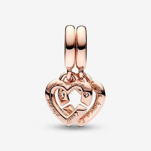 Show off your sisterly bonds with the Linked Sister Hearts Split Dangle Charm. Finished in warm 14k rose gold plating, this charm includes two linked open hearts, each featuring a sparkling clear cubic zirconia stone and engraving (one says "Sis" and the other reads "Sister"). On the back, each heart has small heart-shaped cut-outs and is engraved with "I will always have a friend". The hearts can be separated, so one can be gifted to your sister –a reminder of your forever bond.