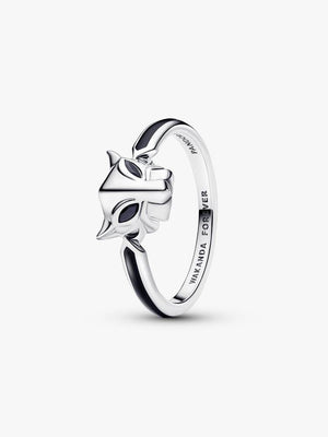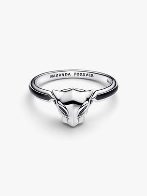 Channel the power of Wakanda's legendary warrior king with a ring inspired by Marvel's Black Panther. Made of sterling silver and set with two black man-made crystals, it features a 'WAKANDA FOREVER' engraving.