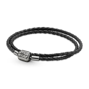 Forge your own path when you wear this Pandora Moments Star Wars Clasp Double Black Leather Bracelet. Inspired by the Star Wars films, the double wrap braided leather bracelet features a barrel shaped, ruthenium-plated Star Wars logo clasp. This piece can be combined with up to 14-18 charms and dangles. Wear it alone or add all your favourite Star Wars charms, bringing the power of the galaxy to your style.