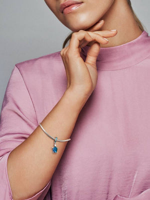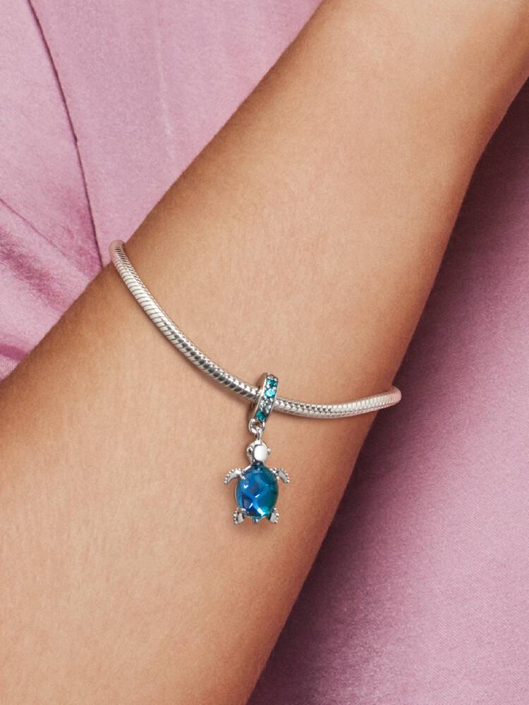 The Murano Glass Sea Turtle Dangle Charm is inspired by the peaceful creatures of the deep blue sea. The sea turtle charm features bleached aqua blue crystals, icy green crystals and a single peacock Murano glass bead. The sterling silver cut-out pattern on the belly of the turtle features a heart and shines through the Murano glass to create a beautiful scale-like effect that dances with the light.