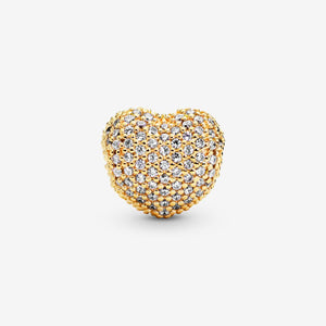 This luminous and heart-shaped Pave Heart Clip Charm is plated with 14k gold and set with clear cubic zirconia stones. A striking contrast and a wonderful hand-finished emblem of love. This clip charm features no silicone grip, so it will slide if not styled onto threads (two raised charm dividers).