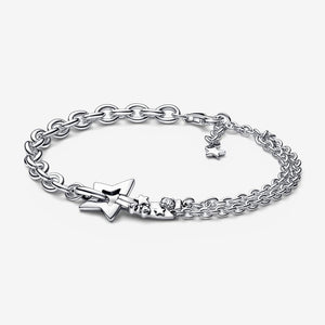 Wear the magic of the winter night sky as part of your bracelet stack. This asymmetrical bracelet features a central shooting star shape with two moving pieces forming star trails, leading into a double chain, a dynamic contrast with a larger chain on the other side of the bracelet. Crafted from sterling silver, the shooting star is set with sparkling round brilliant-cut cubic zirconia, so you can sparkle like the star you are for the holiday season and beyond.