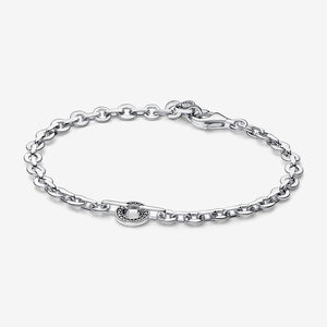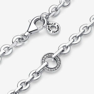 Elevate your signature style with the Pandora Signature Pave Bold Chain Bracelet. Crafted in sterling silver, the bracelet features a single moveable circular shape in the middle, set with sparkle and microbeads for an eye-catching effect. The link chain is made up of oval and rectangular links for a chunky geometrical look. An essential style in every collection, this easy-to-wear adjustable piece stands out on its own or can be stacked with other chain bracelets. Length 18 cm