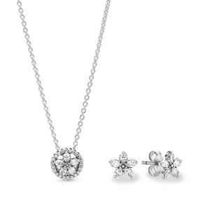 Celebrate the frosty beauty of winter with the Sparkling Snowflake Gift Set. This perfect pair includes the Sparkling Snowflake Stud Earrings and Sparkling Snowflake Collier Necklace. Hand-finished in sterling silver both designs feature sparkling clear cubic zirconia set in the shape of a star-like snowflake. The adjustable necklaces centre motif is surrounded by sparkling pave and a pear-shaped stone dangle from the end of its chain. This set is an ideal holiday gift for someone close to your heart.