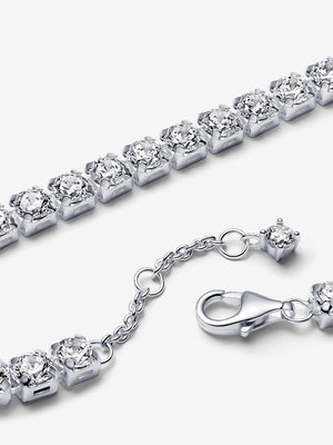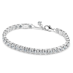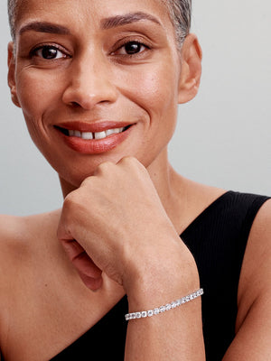 Our reimagined classic tennis bracelet is crafted from sterling silver and features a sparkling row of 34 prong-set round brilliant-cut cubic zirconia. Designed with layering in mind, this is the ultimate piece to add scale and depth to your stacks with its larger stone size. Wear yours as a sparkling statement all season and beyond, or wrap it up as a glittering surprise for the one you love.
