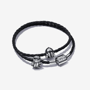 Here is a gift set as dark and mysterious as the series that inspired it. Fans of Star Wars: The Mandalorian can dress up this versatile bracelet set with their most stylish looks, while celebrating the iconic symbols and characters they love. The bracelet is the Pandora Moments Star Wars Double Clasp Black Leather Bracelet with contrasting dark and ash gray tones. With it comes the Star Wars Grogu Charm and Star Wars: The Mandalorian Helmet Charm both made of smooth and durable ruthenium plating.