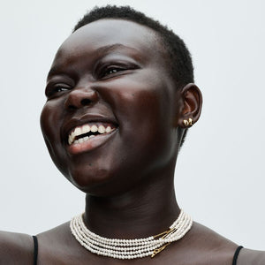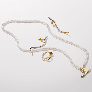 Introducing a new kind of classic with the Treated Freshwater Cultured Pearls T-bar Collier Necklace. This necklace features a row of tiny, elongated treated freshwater cultured pearls that close with an organically-shaped 14k gold-plated T-bar closure. Each treated freshwater cultured pearl is unique and can vary in size and colour; normal wear and tear may occur with this material. Our freshwater cultured pearls are treated with bleaching and lustre enhancement. Length 45 cm.