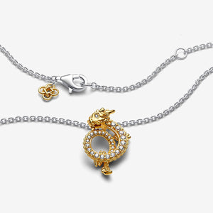 Invite good fortune in the coming year with the Two-tone Chinese Year of the Dragon Collier Necklace. 2024 is the Year of the Dragon - the 5th animal in the Chinese zodiac, this mythical creature represents good fortune, strength, power, wisdom and health. This sterling silver necklace features a curled dragon pendant in 14k gold plating with intricate details and a row of sparkling Pave along the dragon's body. The pendant is not detachable and slides freely along the sterling silver chain, which is adjustable in length. A 14k gold-plated peace knot dangles near the clasp. Wear this necklace to invite the qualities of the dragon into your year ahead, or gift it to a loved one who was born in the Year of the Dragon. Length 45 cm.