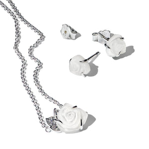 Give the gift of elegance of our White Rose in Bloom Jewelry Gift Set, a sterling silver necklace and earring set featuring delicately prong-set, rose-shaped white bioresin mother of pearl. Crafted with care and precision, the layered petals create a blooming rose shape, capturing the essence of purity and love. Inspired by the timeless gesture of gifting a rose, this set is a symbol of unyielding affection and makes for a unique gift for someone special.