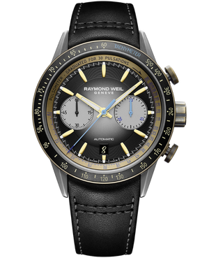 RAYMOND WEIL unveils the new freelancer bi-compax chronograph 7780, an eye-catching vintage-inspired watch perfectly suited to free thinkers and creative individuals.The RAYMOND WEIL freelancer Chronograph 7780 is available in two variants: one with a bronze case and orange accents, limited to just 300 pieces, and this model, the reference 7780-tb3-20423, with a bronze and titanium case and blue accents.The symmetrical bi-compax layout features a 30-minute chronograph counter and a small seconds display. The golden hour and minute hands are generously proportioned and, in conjunction with the applied indexes, prove highly legible. The hour track is snailed, while the hands and indexes feature luminescent treatment, augmenting readability in restricted light. The colour of the central chronograph seconds hand, the hand on the 30-minute register and the numerals on the pulsometer scale are all presented in blue shades.A date display is positioned at 6 o’clock, once again contributing to the overall symmetry of the dial. The date disc is presented in black, matching the colour of the dial, a detail much appreciated by watch enthusiasts. The tachymeter scale, presented on the bezel, provides the means to determine the speed of a motorbike, or vehicle of your choice, over a known distance. Residing on a golden-toned flange, a pulsometer scale allows the wearer to determine the heart rate of an individual. A notable characteristic of this dial is that it wonderfully plays with shades, depths and textures, contributing to the watch’s sophisticated appearance.The movement, the Calibre RW5030, is visible via the exhibition case back. Once again, the attention to detail is clear to see. For example, the watch is fitted with a W-shaped skeleton oscillating weight, a reference to the founder’s surname. A further attribute of this automatic movement is that assuming the mainspring is fully wound, the watch will run autonomously for 56 hours. The watch comes on a black calf leather strap. It is enlivened with contrasting stitching and paired with a titanium folding clasp equipped with a double push-security system.
