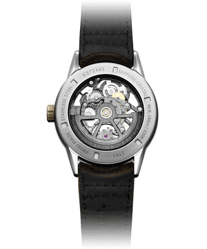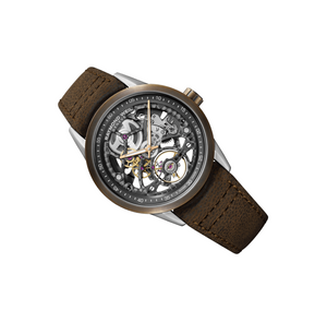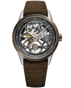 Revered by man and one of the earliest metal alloys created, Bronze defined a significant evolution for mankind and has captivated him ever since.Combining materials from the past with Swiss precision craftsmanship of today is the latest freelancer skeleton Calibre RW1212 from RAYMOND WEIL.Housed in a 42mm stainless steel case with solid bronze bezel, each watch has a unique, rich patina and self-indulgent lustre. Ambitiously re-invented with a fully skeletonised dial, this new design provides more transparency and depth to the balance wheel at 6 o’clock illustrating the technical ingenuity to the exclusive, in-house developed movement.An aged, brown leather strap completes the sophisticated aura and independent bearing of this remarkable watch. Water resistance upto 50 meters.