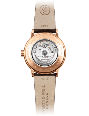 Equipped with a mechanical movement with automatic winding, this maestro features a rose gold PVD stainless steel 40mm case, a grey with Arabic numerals dial, rose gold hands and a brown leather strap to enhance the traditional look of this watch. The RW4200 mechanical with automatic winding movement features a 38-hour power reserve.The maestro, meaning “master”, demonstrates the mastery of RAYMOND WEIL Swiss horology and celebrates the world of classical music and the esteem commanded by a grand personality, composer, or conductor. This mechanical watch collection combines elegance and sophistication with innovation, featuring some of the most renowned technical complications of the Swiss watchmaking tradition.