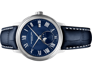 This maestro moon phase watch for men features an RW4280 mechanical self-winding movement and housed in a 40mm-diameter stainless steel case with a date window at 3 o’clock. The blue dial with white Roman numerals is enhanced by the baton-shaped steel hands, the delicate wave-like center motif, and a moon-phase indicator positioned at 6 o’clock offering a stellar view via a crescent-shaped aperture.