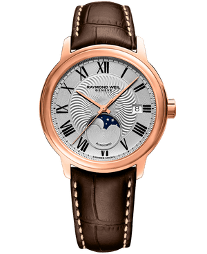 This maestro moon phase watch for men features an RW4280 mechanical self-winding movement and housed in a 40mm-diameter stainless steel with rose gold PVD plating case, with a date window at 3 o’clock. The silver dial with black Roman numerals is enhanced by the baton-shaped steel hands, the delicate wave-like center motif, and a moon-phase indicator positioned at 6 o’clock offering a stellar view via a crescent-shaped aperture.RAYMOND WEIL, a distinguished horological performer, once again celebrates the elegance and timelessness with the maestro Moon Phase. A complication synchronizing the rhythms of time with the poetry of the stars, developed in the pure Swiss watchmaking tradition. This new model is offered in numerous variations all symbolizing the Brand’s deep attachment to its watchmaking roots. water resistance upto 50 meters.