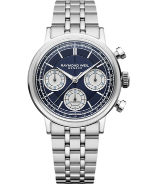 The millesime Tri-Compax Chronograph blends timeless design with modern elegance. Every detail of the millesime Tri-Compax Chronograph contributes to mechanical brilliance. Housed in a vintage-inspired sapphire crystal glass-box, the bezel contributes to the refined and luxurious feel of the timepiece. The midnight blue dial is enhanced with a snailed minute track and the central area of the dial is adorned with a delicate vertical brush. Both the hands and indexes are lined with luminescent treatment, aiding readability in restricted light. A white tachymeter scale surrounds the deep midnight blue dial, adding a sporty, dynamic touch. Reminiscent of the iconic Panda dial, this chronograph evokes elegant athleticism with three silver counters, accented by light blue Arabic numerals. The 39.5mm stainless steel case encompasses a combination of smooth and snailed contrasting finishes and is attached to a stainless steel bracelet. At the heart of the millesime tri-compax chronograph sits the RW5030 mechanical chronograph self-winding movement. Visible through the exhibition case back, this automatic movement has a power reserve of 62-hours, ensuring accuracy and reliability for all of your adventures. As the name suggests, the millesime collection is a grand vintage interpretation of the RAYMOND WEIL brand. This collection pays homage to the rich heritage and traditions of horology while celebrating the simplicity of refined design. The brand has naturally delved into the past, creating timepieces that offer period charm combined with present-day practicality. The result is a symphony of complex details that captivates watch enthusiasts and connoisseurs alike.