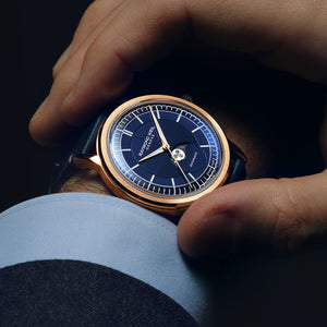 The millesime moon phase marks a fresh take on this iconic horological function: with its visually striking, sectorized dial, this model offers a reading of the lunar phases that is both dynamic and intuitive. The implementation of the moon phase, an emblematic watchmaking function, heralds a new face of creative elegance for RAYMOND WEIL. The midnight blue sector dial, located beneath a vintage-inspired sapphire crystal glass-box, has been refined to the highest degree. The hours and minutes are eloquently conveyed with silver-toned hands, lined with Super-LumiNova®. The sector dial presents the hours, minutes and seconds periods on discrete tracks, augmenting readability. A closer inspection of the dial reveals contrasting finishes, the hour track is smooth, the minute track is snailed and the central area of the dial is adorned with a delicate vertical brush. This timepiece features Super-Luminova® indexes and a 6 o’clock aperture displaying the moon phase, specifically designed for the collection, embracing graphic and classic horological codes. The unique moon design, inspired by traditional horology with a modern twist, showcases a smiling face accompanied by planets and stars, conveying a clear and positive message to the wearer. The bezel is decorated with a vertical satin-brush that contrasts wonderfully with the highly polished bevel nearby. This juxtaposition of two finishes reinforces the overall level of finishing. A sapphire caseback affords sight of the self-winding movement within and the “W-shaped” oscillating weight, RAYMOND WEIL’s horological signature. The navy blue genuine calf leather strap is enhanced with a unique W-stitched detail. As the name suggests, the collection is a grand vintage interpretation of the RAYMOND WEIL brand.