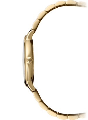 Equipped with a quartz movement and made entirely of stainless steel, this toccata men’s watch features a 39 mm stainless steel case with yellow gold PVD plating and a date window at 3 o’clock. The white lacquered dial is set with applied Roman numeral indexes and has a railway-track chapter ring that aids readability. To complement this modern classic, a pair of blue hands has been added.Refined design and timeless materials: the toccata collection celebrates the artistic and musical spirit behind the Brand’s DNA. Following in the footsteps of the great composers, toccata timepieces promote the Swiss horology of RAYMOND WEIL while respecting the tradition and heritage handed down from generation to generation within the family company.