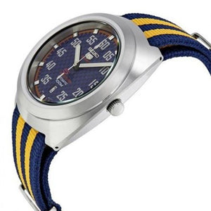 Stainless steel case with a striped nylon strap. Fixed stainless steel bezel. Blue dial with luminous hands and Arabic numeral minute markers (at 5 minute markers). Minute markers around the outer rim. Dial Type: Analog. Luminescent hands and markers. Date display at the 6 o'clock position. Seiko caliber: 4R35 automatic movement with a 41-hour power reserve. Scratch resistant Hardlex crystal. Pull / push crown. Transparent case back. Case size: 44 mm. Case thickness: 13 mm. Tonneau case shape. Band width: 22 mm. Tang clasp. Water resistant at 100 meters / 330 feet. Functions: date, hour, minute, second. Sport watch style. Seiko 5 Sports Blue Dial Nylon Mens Watch SRPA91K1.