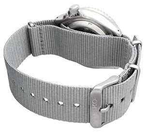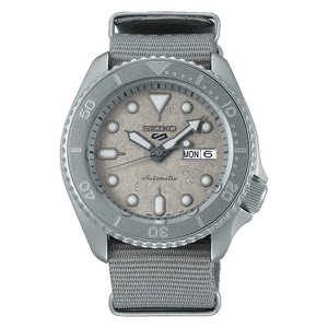 Seiko 5 sports cement automatic mens watch SRPG61K1. Stainless steel case with a grey nylon strap, grey dial. Automatic movement with manual winding. Case thickness: 13.4 mm, case diameter: 42.5 mm, case length: 46 mm. Water resistance upto 100 meters / 10 bar. Duration approx. 41 hours. Hardlex crystal. Lumibrite on hands and index(es). Screw case back. See-through case back. Unidirectional rotating bezel. 24 jewels, day/date display, stop second hand function.