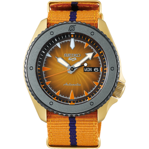 Seiko 5 sports Naruto Uzumaki limited edition men's watch SRPF70. Stainless steel case with yellow gold color plating. Yellow nylon strap and gold dial. Case diameter 42.5mm, case thickness 13.4mm. Water resistance upto 100m. Automatic movement. Caliber 4R36, with 24 jewels and 41 hours power reserve. Hardlex crystal. See through screw case back.