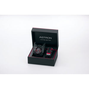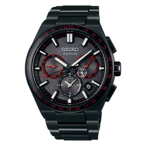 Stylish colors set this limited edition apart. The black titanium case is accented with red for a powerful and active look. A dial pattern resembling asphalt imbues the watch with a quality matched to the tenacity of the next generation. In addition to a titanium bracelet, a reinforced two-tone silicone strap color-coordinated to match the watch is also included. 42.7mm case. Water resistance up to 100 meters. GPS solar movement. Super-clear coating sapphire crystal. Three-fold clasp with push button release.
