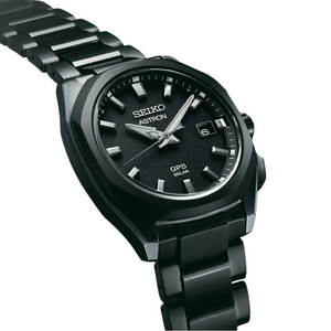 Seiko Astron solar mens watch SSJ009. Titanium (super hard coating) with ceramic bezel, black dial. Titanium (super hard coating) bracelet. GPS Solar movement ±15 seconds per month (without receiving a GPS signal and at temperatures between 5°C and 35°C ). Case diameter 39.0mm, thickness 12.3mm. Sapphire crystal Super-clear coating. Three-fold clasp with push button release. 20 bar, 200 meters water resistance. Allergy-safe metal, Clasp with smart adjuster function, Screw case back.
