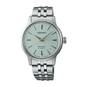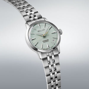 Seiko Presage 34mm Cocktail Time automatic women's watch SRPL61. Stainless steel case and bracelet with light green skydiving dial. Automatic monement. Water resistance up to 50 meters. Case size 34 mm. Box shaped hardlex crystal. Deployment clasp with push button release.