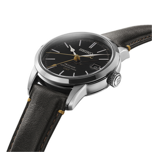 Seiko Presage craftsmanship series automatic mens watch SPB447. Stainless steel (super hard coating) case with brown leather strap, black dial. Automatic movement. Water resistance up to 100 meters. Dual-curved sapphire crystal with anti-reflective coating on inner surface. Three-fold clasp with push button release.