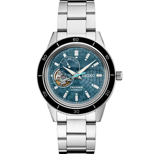 Seiko presage ginza limited edition automatic mens watch SSA445J1. Stainless steel case and bracelet, blue dial. Automatic movement with manual winding. Case thickness: 12.8 mm, case diameter: 40.8 mm, case length: 47 mm. Water resistance up to 50 meters / 5 bar. Duration approx. 41 hours. Box-shaped Hardlex crystal. Lumibrite on hands and indexes. Three-fold clasp with push button release. LIMITED EDITION on the case back. Screw case back. See-through case back. 24 jewels, 24-hour hand, stop seconds hand function.