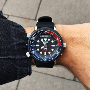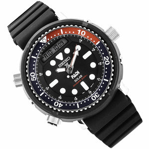 Seiko prospex solar mens watch. Accuracy ±15 Seconds per month. 10 months power reserve (when fully charged). Dual-time function, alarm function (daily alarm), power save function. LED (the built-in illuminating light). Case material stainless steel and plastic. Black silicone strap and black dial. Hardlex crystal. Case size 47.8 mm.Water resistance upto 200 meters.
