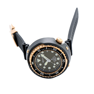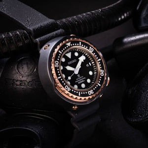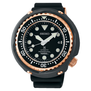 Seiko prospex automatic mens watch SLA042J1. Stainless steel case with a Silicone strap, black dial. Case size 52.4 mm. Water resistance upto 1000 meters. Automatic movement. Sapphire crystal. Pin buckle clasp.